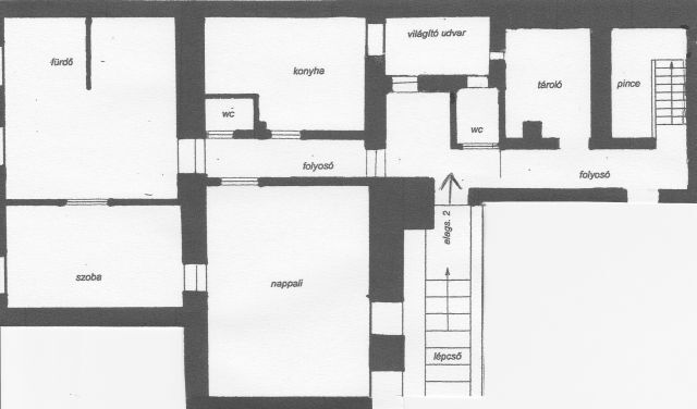 Az udvarról nyílik a 125 m2 alapterületet elfoglaló szuterén ingatlan. Ebből a területből 100 m2 a lakás és 25 m2 az előtér, pince és tároló.