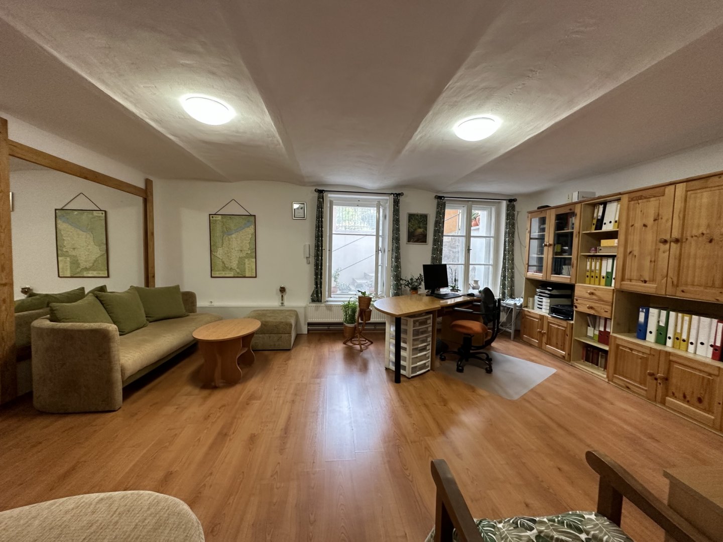 A lakórész helyiségei: 2 szoba, folyosó, konyha, fürdő, wc. A lakás 10 éve esett át teljes felújításon, majd 5 évvel ezelőtt kisebb átépítésen.